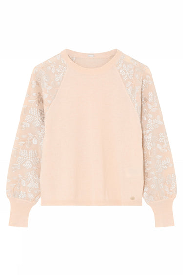 OBS! Fjernlager. Levering kan blive forlænget med 2-3 dage, hvis varen ikke findes i vores butik lige nu.Feminin strik fra Gustav med lange let puffede ærmer, rund hals og de smukkeste broderet detaljer.