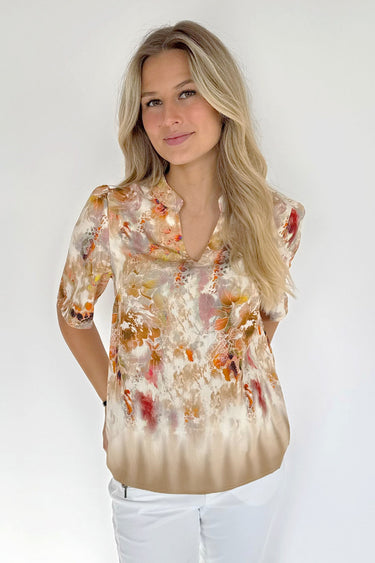 OBS! Fjernlager. Levering kan blive forlænget med 2-3 dage, hvis varen ikke findes i vores butik lige nu.Feminin bluse fra 2-Biz med korte ærmer, kinakrave med v-udskæring i halsen og det smukkeste abstrakte print.