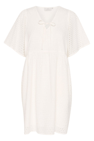 OBS! Fjernlager. Levering kan blive forlænget med 2-3 dage, hvis varen ikke findes i vores butik lige nu.Smart broderi anglaise kjole fra Kaffe med korte brede ærmer, v-udskæring med et lille bindebånd i halsen og en dejlig blød kvalitet.