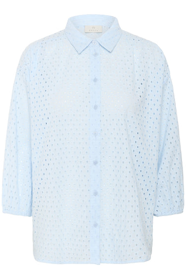 OBS! Fjernlager. Levering kan blive forlænget med 2-3 dage, hvis varen ikke findes i vores butik lige nu.Smart skjortebluse fra Kaffe med ¾ lange ærmer, krave i halsen og knaplukning langs fronten.Skjorten har også en løs silhuet og et flot hullet mønster.