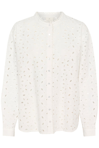 OBS! Fjernlager. Levering kan blive forlænget med 2-3 dage, hvis varen ikke findes i vores butik lige nu.Smuk broderi anglaise skjorte fra Kaffe med lange ærmer, kinakrave i halsen og knaplukning langs fronten.