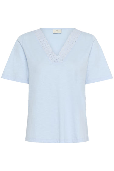 OBS! Fjernlager. Levering kan blive forlænget med 2-3 dage, hvis varen ikke findes i vores butik lige nu.Sød tee fra Kaffe korte ærmer, v-udskæring med den flotteste broderet blondekant i halsen og en dejlig blød kvalitet.