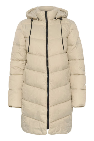 OBS! Fjernlager. Levering kan blive forlænget med 2-3 dage, hvis varen ikke findes i vores butik lige nu.Cool quiltet jakke fra Kaffe med lange ærmer, høj hals og justerbar hætte, lommer i siderne og lynlåslukning langs fronten.