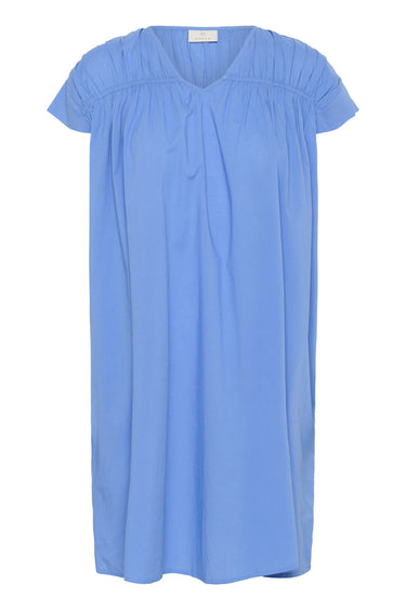 OBS! Fjernlager. Levering kan blive forlænget med 2-3 dage, hvis varen ikke findes i vores butik lige nu.Sød kjole fra Kaffe med små ærmer, v-udskæring i halsen og fine rynkeeffekter over skulderne.