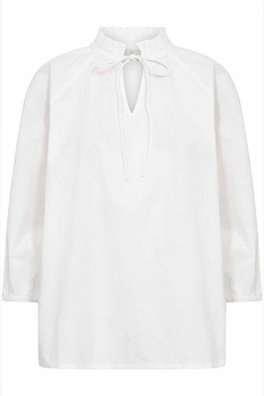 OBS! Fjernlager. Levering kan blive forlænget med 2-3 dage, hvis varen ikke findes i vores butik lige nu.Feminin bluse fra Kaffe med ¾ lange ærmer, høj hals med v-udskæring og et lille bindebånd samt fine broderet detaljer.