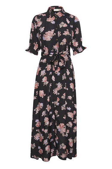 OBS! Fjernlager. Levering kan blive forlænget med 2-3 dage, hvis varen ikke findes i vores butik lige nu.Skøn kjole fra Kaffe med ½ lange pufærmer, en lille skjortekrave i halsen og et matchende bindebælte i taljen.Kjolen har også knaplukning langs fronten, en flot satin kvalitet og et smukt blomstret print.