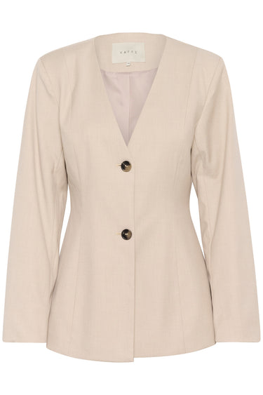 - OBS! Fjernlager. Levering kan blive forlænget med 2-3 dage, hvis varen ikke findes i vores butik lige nu.Flot kraveløs blazer fra Kaffe med lange brede ærmer, v-udskæring i halsen og et figursyet snit med fine knapper foran.