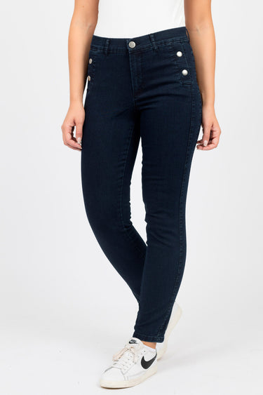 Smarte og velsiddende bukser fra 2-Biz. Buksen har en højtalje, og er lavet i et meget strækbart materiale, så de sidder fantastisk. Der er en fin knap detalje ved lommerne, og modellen er ankellang. Alletiders basis buks, sæt den sammen med en farverig bluse og en blazer.- Mål: Str. 38: indvendig benlængde 75 cm. liv: 39 x 2 cm.