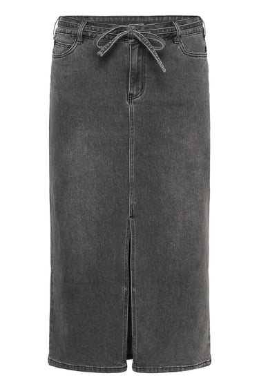 OBS! Fjernlager. Levering kan blive forlænget med 2-3 dage, hvis varen ikke findes i vores butik lige nu.Smart denim nederdel fra Kaffe Curve med slids foran, bindebælte i taljen og et fint enkelt udtryk.