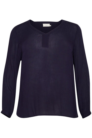 OBS! Fjernlager. Levering kan blive forlænget med 2-3 dage, hvis varen ikke findes i vores butik lige nu.Smart basis bluse fra Kaffe Curve med lange ærmer, v-udskæring i halsen og en dejlig let kvalitet.