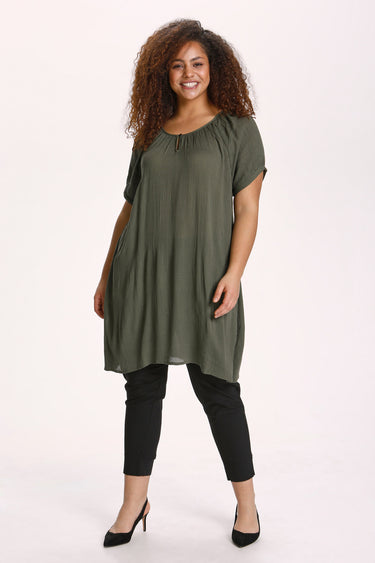 OBS! Fjernlager. Levering kan blive forlænget med 2-3 dage, hvis varen ikke findes i vores butik lige nu.Fin enkel tunika fra Kaffe Curve med korte ærmer, rund hals og en afslappet silhuet.