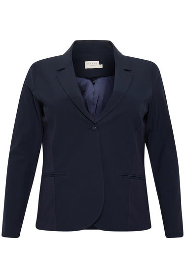 OBS! Fjernlager. Levering kan blive forlænget med 2-3 dage, hvis varen ikke findes i vores butik lige nu.Klassisk blazer fra Kaffe Curve med lange ærmer, v-udskæring i halsen og knaplukning foran.