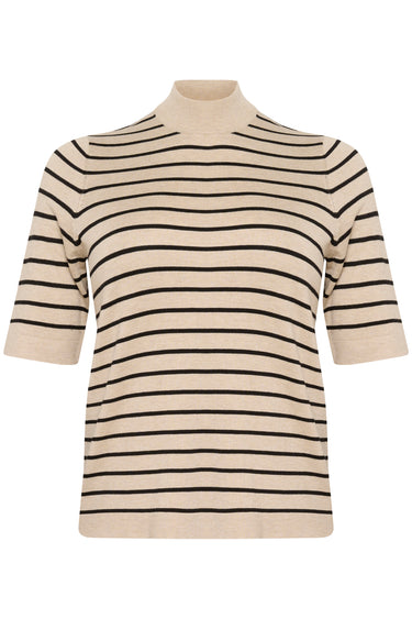 OBS! Fjernlager. Levering kan blive forlænget med 2-3 dage, hvis varen ikke findes i vores butik lige nu.Fin strik fra Kaffe Curve med ½ lange ærmer, høj hals og et klassisk stribet print.