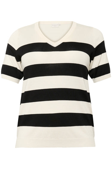 OBS! Fjernlager. Levering kan blive forlænget med 2-3 dage, hvis varen ikke findes i vores butik lige nu.Sød strik fra Kaffe Curve med korte ærmer, v-udskæring i halsen og et bredt stribet mønster.