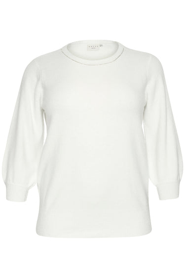 OBS! Fjernlager. Levering kan blive forlænget med 2-3 dage, hvis varen ikke findes i vores butik lige nu.Blød og lækker strik fra Kaffe Curve med ¾ lange ærmer, tætsiddende ribmanchetter og rund hals der er detaljeret med en super fin lille glimmerkant.