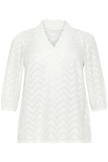 - OBS! Fjernlager. Levering kan blive forlænget med 2-3 dage, hvis varen ikke findes i vores butik lige nu.Sød bluse fra Kaffe Curve med ¾ lange ærmer, v-udskæring i halsen og et super fint tone-i-tone mønster.