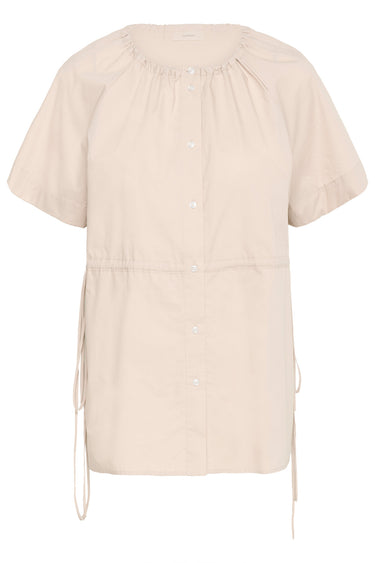 OBS! Fjernlager. Levering kan blive forlænget med 2-3 dage, hvis varen ikke findes i vores butik lige nu.Flot bluse fra InWear med korte ærmer, rund hals og fine bindesnore i taljen der giver blusen et feminint snit.