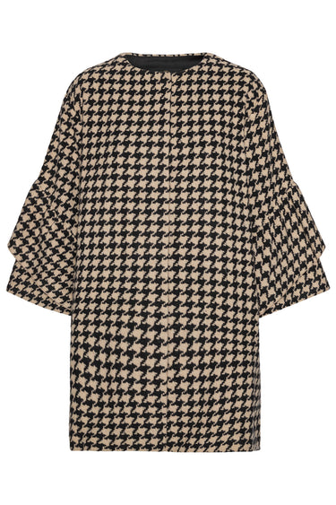 OBS! Fjernlager. Levering kan blive forlænget med 2-3 dage, hvis varen ikke findes i vores butik lige nu.Smuk uldfrakke fra Karmamia med ¾ lange ærmer, rund hals og den lækreste kvalitet.Frakken har også flotte peplum detaljer i ærmerne, et klassisk houndstooth mønster og skjult trykknaplukning langs fronten.