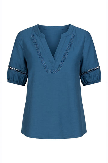 OBS! Fjernlager. Levering kan blive forlænget med 2-3 dage, hvis varen ikke findes i vores butik lige nu.Sød bluse fra 2-Biz med ½ lange let puffede ærmer, rund hals med v-udskæring og små broderet løkker.