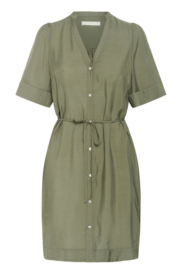 OBS! Fjernlager. Levering kan blive forlænget med 2-3 dage, hvis varen ikke findes i vores butik lige nu.Sød kjole fra InWear med korte ærmer, v-udskæring i halsen og et smalt bindebælte i taljen.Kjolen er også gennemknappet og har en super lækker kvalitet.