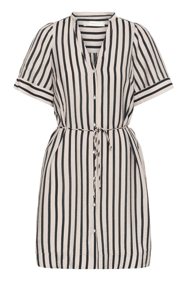OBS! Fjernlager. Levering kan blive forlænget med 2-3 dage, hvis varen ikke findes i vores butik lige nu.Sød kjole fra InWear med korte ærmer, v-udskæring i halsen og et smalt bindebælte i taljen.Kjolen er også gennemknappet og har en super lækker kvalitet.