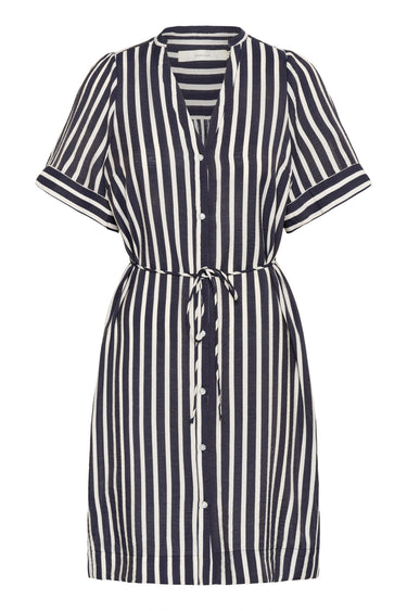 OBS! Fjernlager. Levering kan blive forlænget med 2-3 dage, hvis varen ikke findes i vores butik lige nu.Sød kjole fra InWear med korte ærmer, v-udskæring i halsen og et smalt bindebælte i taljen.Kjolen er også gennemknappet og har en super lækker kvalitet.