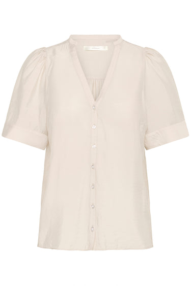 OBS! Fjernlager. Levering kan blive forlænget med 2-3 dage, hvis varen ikke findes i vores butik lige nu.Sød top fra InWear med korte ærmer, v-udskæring i halsen og knaplukning langs fronten.