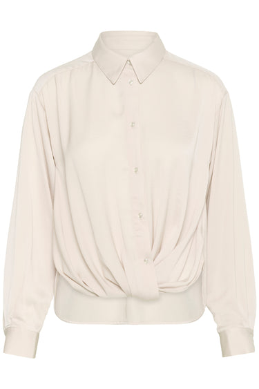 OBS! Fjernlager. Levering kan blive forlænget med 2-3 dage, hvis varen ikke findes i vores butik lige nu.Elegant top fra InWear med lange ærmer, skjortekrave i halsen og en super flot knude-detalje i bunden der skaber fine draperet effekter langs fronten.