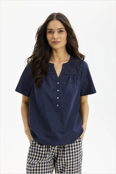- OBS! Fjernlager. Levering kan blive forlænget med 2-3 dage, hvis varen ikke findes i vores butik lige nu.Sød bluse fra In Front med korte ærmer, rund hals med v-udskæring og et kort knappanel over brystet.Blusen er også detaljeret med et smukt hullet mønster over skulderne.