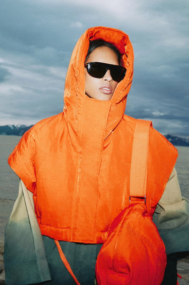 Cool vest fra Rabens Saloner med en cropped længde, boxy silhuet og detaljeret med en stor hætte, man kan putte sig i, og har en praktisk lynlåslukning foran.