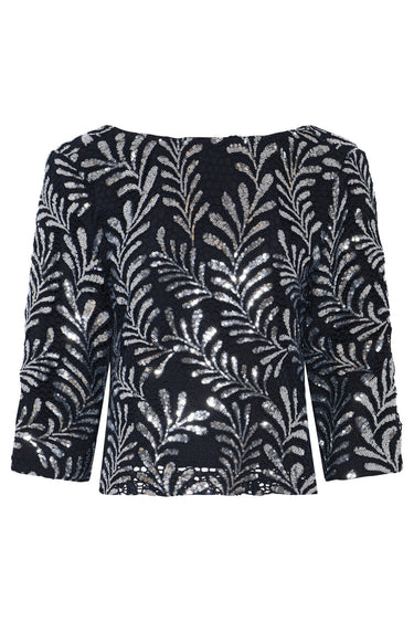 OBS! Fjernlager. Levering kan blive forlænget med 2-3 dage, hvis varen ikke findes i vores butik lige nu.Smuk bluse fra Bruuns Bazaar med ¾ lange ærmer, bådudskæring i halsen og en cropped længde.Blusen har også den smukkeste broderet pailletkvalitet.