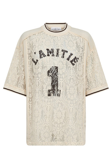 OBS! Fjernlager. Levering kan blive forlænget med 2-3 dage, hvis varen ikke findes i vores butik lige nu.Super cool tee fra Haute L'Amite der kombinerer feminine blonder med et sporty udtryk.T-shirten har rund hals, korte ærmer og en løs silhuet.
