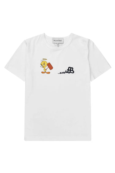 OBS! Fjernlager. Levering kan blive forlænget med 2-3 dage, hvis varen ikke findes i vores butik lige nu.Elegant T-shirt med et fint Tweety-print samt et broderet MUNTHE-emblem på brystet. I nakken findes et "LOONEY TUNES X MUNTHE"-budskab. Denne t-shirt er skabt i samarbejde med Warner Bros. Discovery Global Consumer Products (WBDGCP).