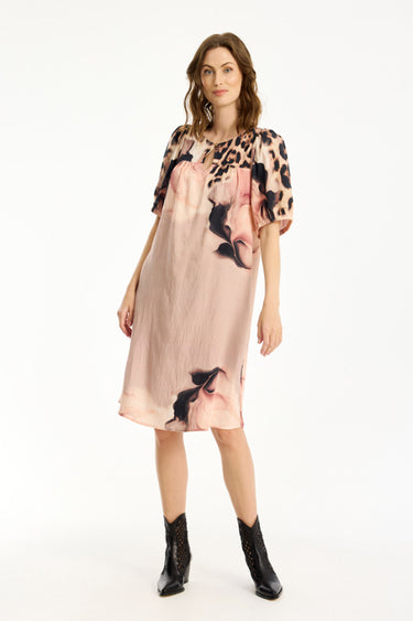 OBS! Fjernlager. Levering kan blive forlænget med 2-3 dage, hvis varen ikke findes i vores butik lige nu.Fin kjole fra In Front med korte pufærmer, rund hals med en lille nøglehulsudskæring over brystet.Kjolen har også en afslappet silhuet og et flot abstrakt print.