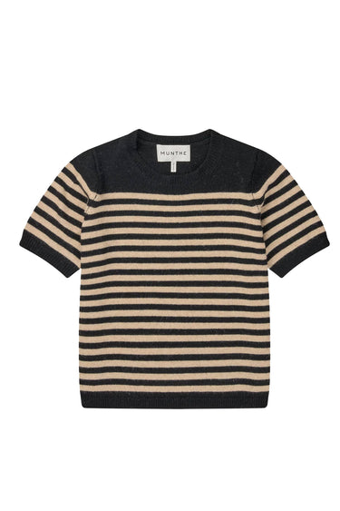 OBS! Fjernlager. Levering kan blive forlænget med 2-3 dage, hvis varen ikke findes i vores butik lige nu.Smuk strik med elegante striber og fine ribdetaljer. Denne strik har korte ærmer og en rund hals.