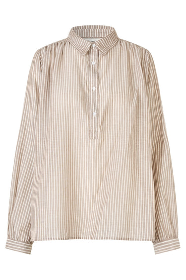 OBS! Fjernlager. Levering kan blive forlænget med 2-3 dage, hvis varen ikke findes i vores butik lige nu.Feminin pinstripe skjorte fra Lollys Laundry med lange ærmer, en lille krave i halsen og et kort knappanel over brystet.
