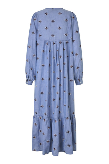 OBS! Fjernlager. Levering kan blive forlænget med 2-3 dage, hvis varen ikke findes i vores butik lige nu.Skøn maxi kjole fra Lollys Laundry med lange ærmer, rund hals med v-udskæring og bindesnor, tætsiddende manchetterne og en bred flæsekant i bunden af skørtet.Kjolen har også en løs silhuet og det flotteste broderet mønster.