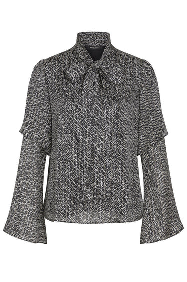 - LaurusBBPina blouse has a regular fit with an elegant front opening, tied with a soft ribbon. The shiny fabric with a metallic effect adds a touch of glamour to the design.Style this blouse with a tight-fitting skirt and heels for a sophisticated everyday look, or with pants for a more relaxed expression.- Regular fit- Tie band at the front- Soft fabric with metallic effectRESPONSIBLE: 98% Viscose (FSC), 2% MetallicThe model is 173 cm and wears size 36