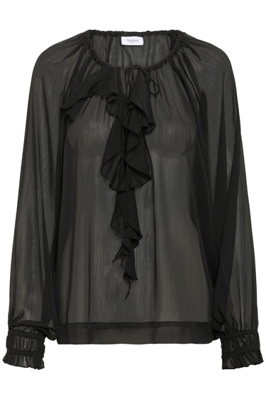OBS! Fjernlager. Levering kan blive forlænget med 2-3 dage, hvis varen ikke findes i vores butik lige nu.Smuk bluse fra Saint Tropez i en let transparent kvalitet med lange ærmer, rund hals med v-udskæring og de flotteste bløde flæser over brystet.