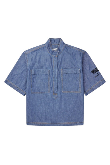 OBS! Fjernlager. Levering kan blive forlænget med 2-3 dage, hvis varen ikke findes i vores butik lige nu.Elegant denimbluse fra Munthe med et fint Tweety- og Sylvester-print på ryggen. Blusen er designet med to lommer og kan knappes op halvvejs ned. Denne bluse er skabt i samarbejde med Warner Bros. Discovery Global Consumer Products (WBDGCP).