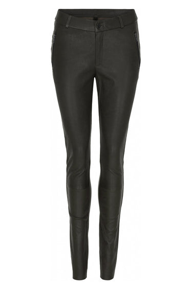 OBS! Fjernlager. Levering kan blive forlænget med 1-2 dage, hvis varen ikke findes i vores butik lige nu.Leggings fra Notyz i smidigt læder med saddle back. Har høj talje, gylp med lynlås og knap. Skrå sidelommer med lynlås. Dekorative sømme under knæene og rå kant forneden.Vær opmærksom på, at materialer af naturlig oprindelse kan variere i farven.