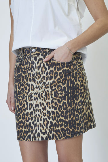 OBS! Fjernlager. Levering kan blive forlænget med 2-3 dage, hvis varen ikke findes i vores butik lige nu.Super cool denim nederdel fra Co'couture med en lille slids bagtil, klassiske lommer og et smart leopardprint.