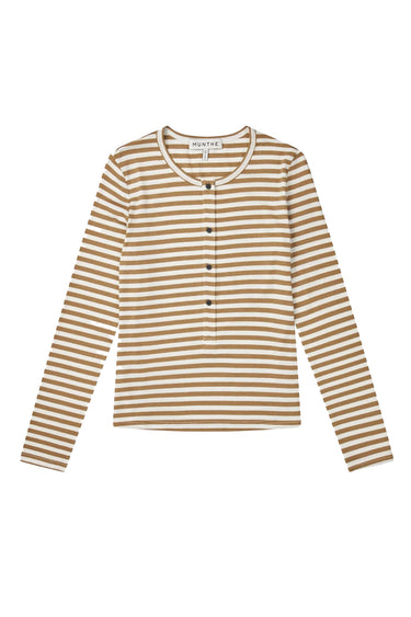 OBS! Fjernlager. Levering kan blive forlænget med 2-3 dage, hvis varen ikke findes i vores butik lige nu.Blød T-shirt med fine, smalle striber og en elegant knaplukning. T-shirten er designet med sorte knapper, rund hals og lange ærmer.
