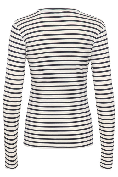 OBS! Fjernlager. Levering kan blive forlænget med 2-3 dage, hvis varen ikke findes i vores butik lige nu.Fin t-shirt fra Kaffe med lange ærmer, bådudskæring i halsen og klassiske striber. T-shirten er også dekoreret med et fint lille hjerte på brystet.