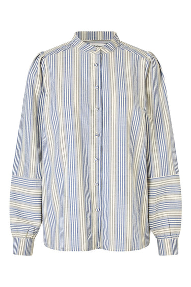OBS! Fjernlager. Levering kan blive forlænget med 2-3 dage, hvis varen ikke findes i vores butik lige nu.Feminin skjortebluse fra Lollys Laundry med lange let puffede ærmer, tætsiddende manchetter, kinakrave i halen og knaplukning langs fronten.