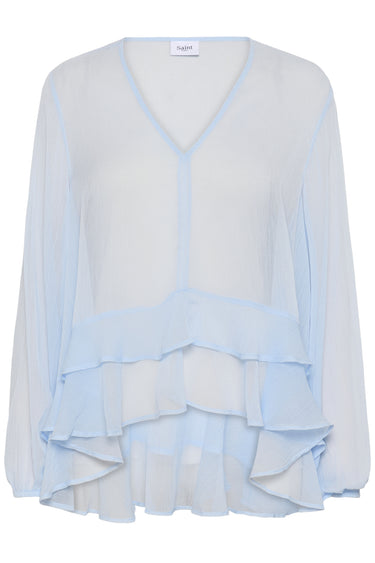 OBS! Fjernlager. Levering kan blive forlænget med 2-3 dage, hvis varen ikke findes i vores butik lige nu.Smuk bluse fra Saint Tropez med lange ærmer, v-udskæring i halsen og de flotteste flæselag der giver blusen et let og luftigt udtryk.