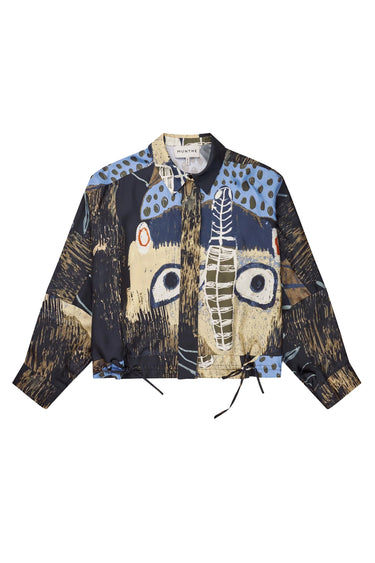 OBS! Fjernlager. Levering kan blive forlænget med 2-3 dage, hvis varen ikke findes i vores butik lige nu.Skjorte fra Munthe med et smukt kunstprint og flotte bindebånds detaljer nederst samt på ærmerne. Skjorten er designet med løse ærmer og kan styles både åben og lukket.