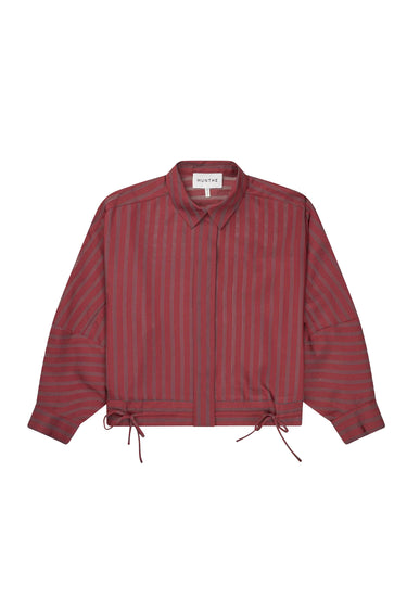 OBS! Fjernlager. Levering kan blive forlænget med 2-3 dage, hvis varen ikke findes i vores butik lige nu.Skjorte fra Munthe med fine, semitransparente striber og smukke bindebånds detaljer nederst samt på ærmerne. Skjorten er designet med løse ærmer og kan styles både åben og lukket.