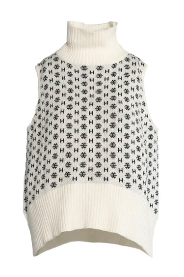- OBS! Fjernlager. Levering kan blive forlænget med 2-3 dage, hvis varen ikke findes i vores butik lige nu.Lækker strik vest fra Hést med rullekrave i halsen, et flot mønster og en løs silhuet.