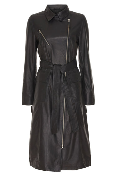 Jakken har en flot asymmetrisk lynlåslukning i fronten der giver det klassiske udtryk et lille twist. Den har også fine lynlås detaljer, lommer og kommer med et bindebælte til at fremhæve taljen.- Pasform: Alm til let løstsiddende